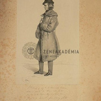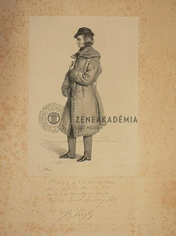 A fiatal Liszt teljes alakú képe magyar zsinóros kabátban és bársony sapkában. A távolban halványan fák és bokrok látszanak. A bal alsó sarokban nyomtatott aláírás: "Kriehuber 840". Jobboldalt alul nyomdai adatok: "Gedr[uckt] bei Joh[ann] Höfelich". A kép egy nagyméretű alaplapra, s így az egész egy hátlapra van ragasztva. A hátlap rectóján a kép alatt Byron-idézet Liszt írásával és aláírásával. (facsimile) A Byron-idézet: "Heres a sigh to those who love me, / And a smile to those who hate, / And, whatever skys above me, / Heres a heart for every fate."