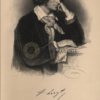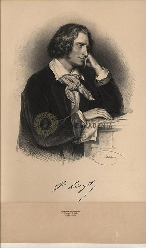 Derékkép Lisztről. Jobbra fordul, bal kezével állát támasztja meg, a jobbal kottalapokra támaszkodik. Jobbra lent jelezve: "Kriehuber". Alul középen Liszt aláírásának facsimiléja, és ez alatt: "Eigentum des Verlegers / Wien bei C. A. Spina, / Graben No. 1133." Balra lent nyomdai adatok: "Gedr[uckt] bei Joh[ann] Höfelich"