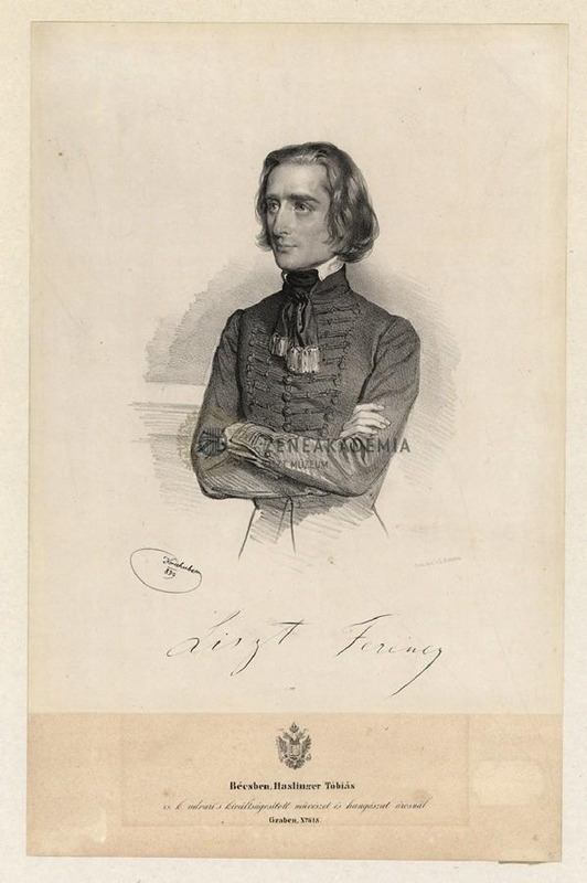 Álló derékkép Lisztről. Zsinóros kabátban van, sálszerű nyakkendővel. Kissé balra fordul, kezét balra teszi. Balra lent jelezve: "Kriehuber 839". Jobbra lent nyomdai adatok: "Gedr[uckt] bei Joh[ann] Höfelich". A kép alatt Liszt magyar aláírásának másolata: "Liszt Ferencz", majd egy kétfejű sasos címer, és ez alatt: "Bécsben, Haslinger Tóbiás / cs.k. udvaris kiváltságosított művészet és hangászat árosnál. / Graben, No. 618."