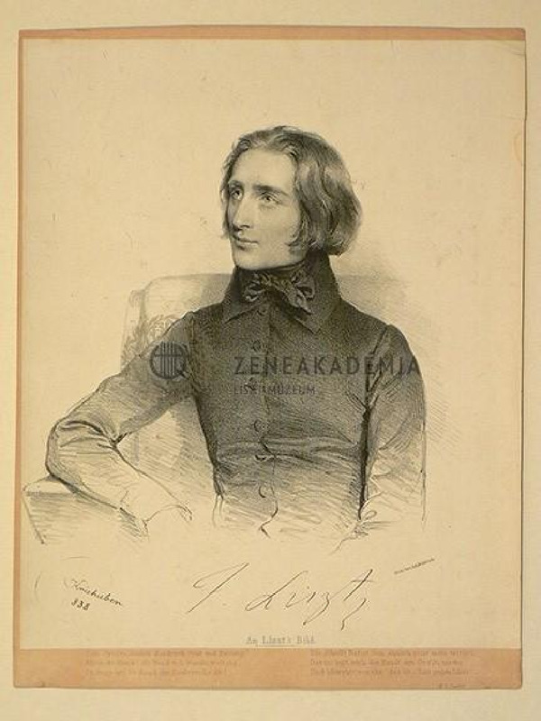 Ülő derékkép Lisztről. Kissé balra fordul, balra néz. Csokornyakkendőt visel, jobb könyökén támaszkodik. Jelezve balra lent: " "Kriehuber 838". Jobbra lent: "Gedr[uckt] bei Joh[ann] Höfelich." Alul Liszt aláírásának hasonmása és ez alatt 6 sor Saphirtól, "An Liszts Bild" címmel: "Zum Spielen ähnlich! Ausdruck, Geist und Haltung! / Allein die Hand? die Hand voll Wunderwaltung. / Ich frage wo die Hand, die Zaubervolle ist? / Die schafft Natur ihm ähnlich nicht mehr wieder, / Darum legt auch die Kunst den Griffel nieder / Und schweigt von ihr, das ist - » List gegen Liszt!« _ / M. G. Saphir"
