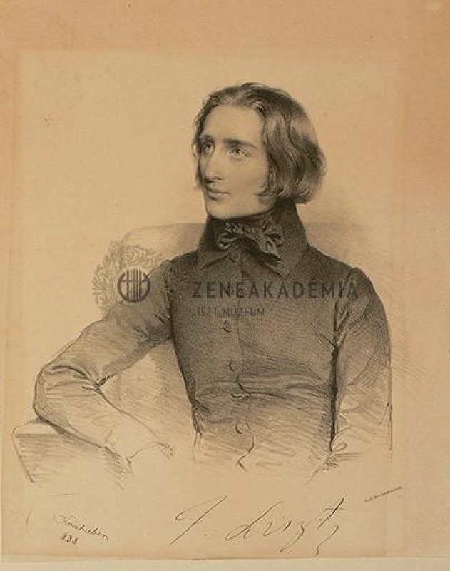 Ülő derékkép Lisztről. Kissé balra fordul, balra néz. Csokornyakkendőt visel, jobb könyökén támaszkodik. Jelezve balra lent: " "Kriehuber 838". Jobbra lent: "Gedr[uckt] bei Joh[ann] Höfelich." Alul Liszt aláírásának hasonmása.