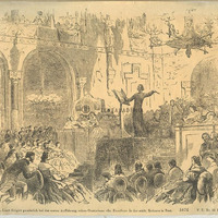 Liszt a terem közepén dobogón áll, körülötte hatalmas tömeg. Jobbra lent jelezve: "RUSZ K:" Alul szöveg: "Franz Liszt dirigiert persönlich bei der ersten Aufführung seines Oratoriums »Sz. Erzsébet« in der städt. Redoute in Pest. 5876. V. U. Nr. 36. 1865." Nagyszokolyai Béla bélyegzője szerepel rajta.