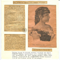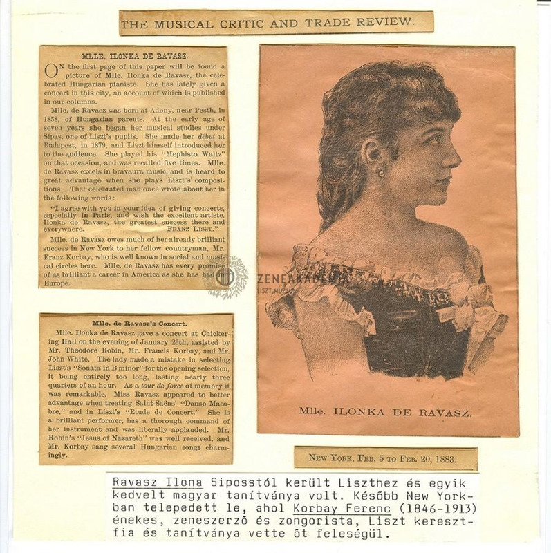 Vállkép, jobb profilból. Haja dús, fonott copfban van. Vállpántos, fodros ruhában van. A kép alatt: "Mlle. ILONKA DE RAVASZ." Kartonlapra ragasztva, újságkritikákkal a "THE MUSICAL CRITIC AND TRADE REVIEW"-ből, New York, Feb. 5 to Feb. 20, 1883.