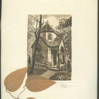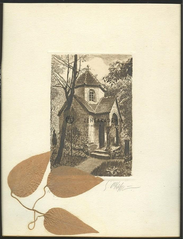 Kis sírkápolna-épület ösvénnyel, fákkal. Jelzés a jobb alsó sarokban: "Buschbaum". A képet keretező fehér karton alap-lapon ceruzás feljegyzések (példányszámozás?) és ráragasztva 3 préselt levél.