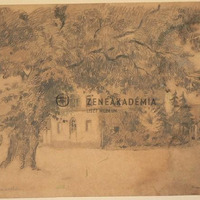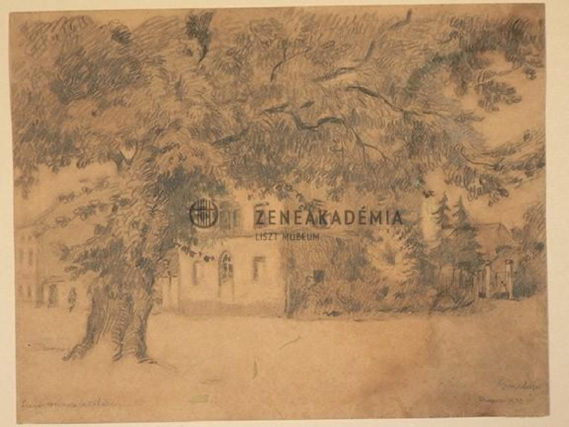 Emeletes épület látszik fától takartan. A kép bal alsó sarkában: "Liszt weimari lakóháza". Jobbra: "Gimes Lajos / Weimar 1923 - "
