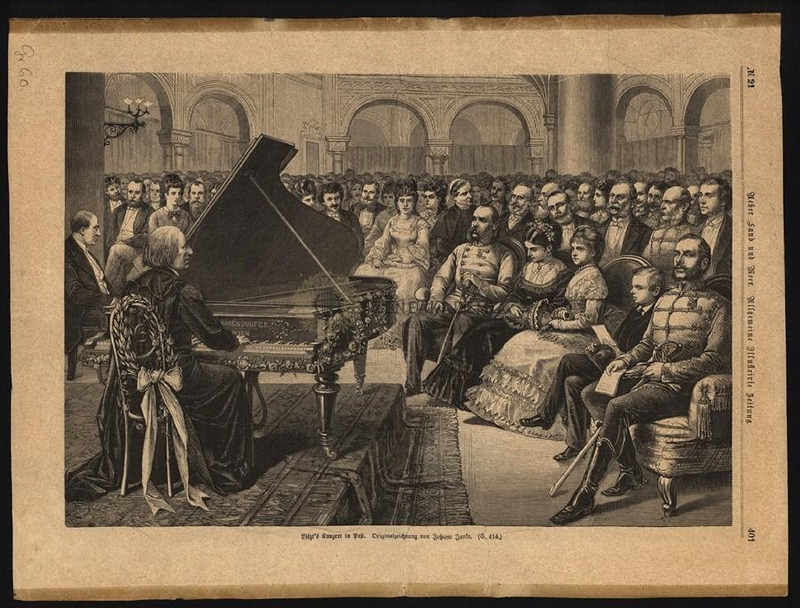Liszt egy szőnyeggel borított dobogón, virággal feldíszített Bösendorfer zongorán játszik a pesti Vigadóban. Háttal ül, a terem tele van emberekkel, a király és az udvar is jelen van. A kép alatt nyomtatott szöveg: "Liszts Konzert in Pest. Originalzeichnung von Johann Janko (S. 414.)" Jobb oldalon keresztben nyomtatva: "N. 21. Ueber Land und Meer. Allgemeine Illustrirte Zeitung. 401" Az eredeti rajzot Jankó János készítette Franz Schams és Ernst Lafite festménye alapján.