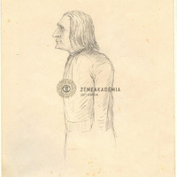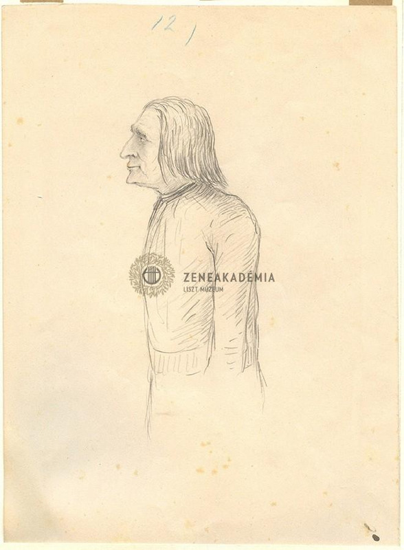 Álló derékkép az abbé Lisztről, balra fordul, fejét előre tolja. Hátoldalán felirat: "Liszt Ferenc arcképe. Rajzolta édes atyám / Heckenast Gusztáv. A Zeneművészeti főiskola / Liszt szobájának emlékül adta Sladovich Nándorné / szül. Heckenast Mária."