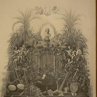 Liszt mellszobra hangszerek és növények között. A mellszobor felett líra, illetve Liszt születési éve: "1811". Lent különféle hangszerek és éneklő nők csoportja. Koszorú: városnevekkel, ahol Liszt járt. Kották: Liszt-művek címeivel. Jelezve jobbra lent: "Nbrg" vagy "Wbr" [Weber ?]