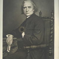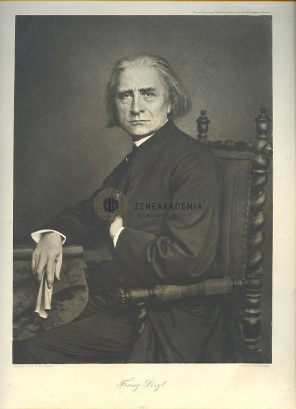 A középkorú Liszt karosszékben ül, balra fordul, szembe néz. Jobbját asztalon nyugtatja, kezében papírlapot tart. Balját a kabátjába dugja a mellén. Jelezve a képmező fölött jobbra: "Franz Hanfstaengl, München, London & New York. Printed in Munich." Balra lent: "Photogr. nach dem Leben." Jobbra lent: "Gravure Hanfstaengl". Középen: "Franz Liszt".