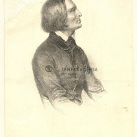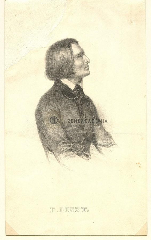 Derékkép, szerzője ismeretlen. Liszt jobbra fordul, kissé felnéz. Hasonló Kriehuber "Une matinée chez Liszt" c. csoportképének Lisztjéhez, de ott Liszt ellentétes irányba néz, ruhája sem azonos. Szignálatlan. Lent középen: "F. LISZT"