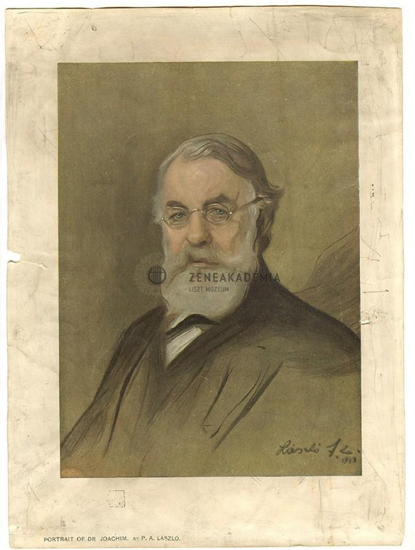 Az idős művész kissé balra fordul, szembenéz. Bajszos, szakállas, szemüveges. Jelezve a jobb alsó sarokban: "László F. E. 1903." A képmező alatt baloldalt nyomtatott felirat: "Portrait of Dr Joachim, by P. A. László." [Philip Alexius]