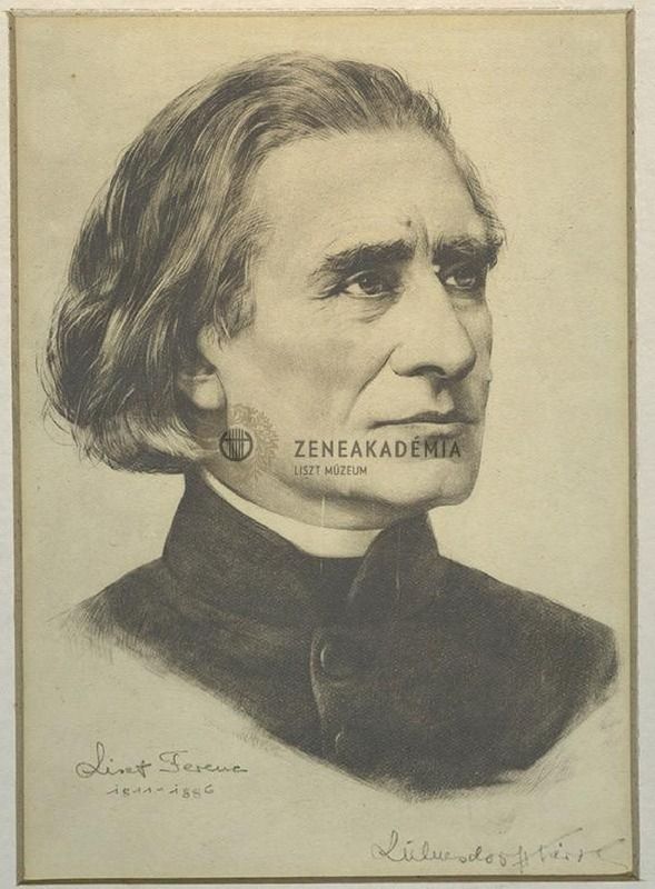 Az abbéruhás, de nem idősarcú Liszt jobb félprofilban. Orra mellett éles vonás. Balra lent: "Liszt Ferenc / 1811-1886" Jelezve jobbra lent: "Lühnsdorff Károly"