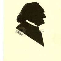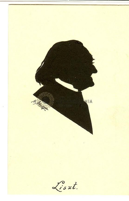 - Az idős, beesett ajkú Liszt árnyképe jobb profilban. Jelezve balra lent: "H. Allmayer". Alul középen felirat: "Liszt"