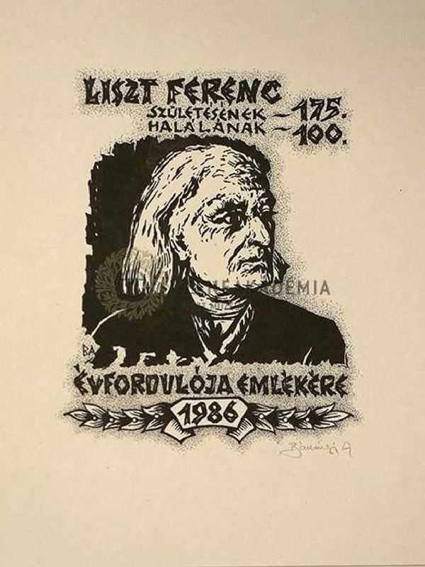 Jobbra tekintő vállkép az idősödő Lisztről. A kép felett kezdődő és alatta folytatódó felirat: "LISZT FERENC/SZÜLETÉSÉNEK 175. / HALÁLÁNAK 100. / ÉVFORDULÓJA EMLÉKÉRE/ 1986" Alatta aláírás: "Bánsági A." Hátoldalon szignálva.