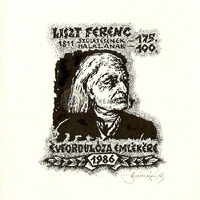 Jobbra tekintő vállkép az idősödő Lisztről. A kép felett kezdődő és alatta folytatódó felirat: "LISZT FERENC/SZÜLETÉSÉNEK 175. / HALÁLÁNAK 100. / ÉVFORDULÓJA EMLÉKÉRE/ 1986" Alatta aláírás: "Bánsági A." Hátoldalon szignálva.