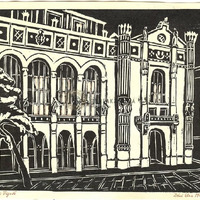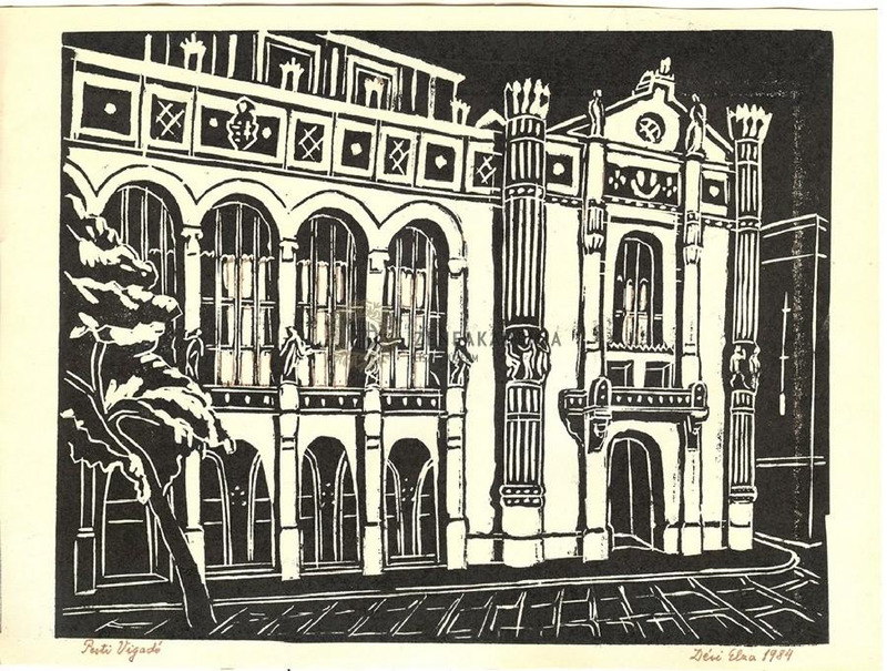- A Vigadó klasszicista stílusú, felépített épülete szemből ábrázolva. Bal szélen egy megdőlt fa. Fekete-fehér.