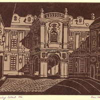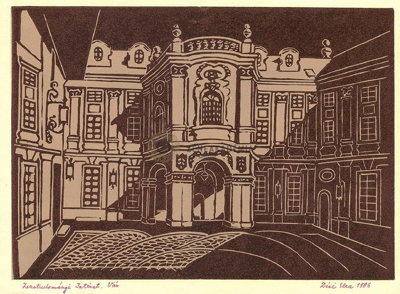 - A budai Erdődy-palota barokk stílusú épületének belső udvara. Barna-mályva színű.