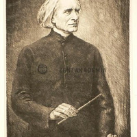Liszt Ferenc jobbra néző derékképe, abbé ruhában, vezénylőpálcával. Jobbra lent szignálva ceruzával: "Paulovits".