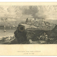 Lissabon látképe az Almeida erődből, a Tajón innen. Előtérben sziklaszirt, rajta vár, templom, házak, katonák, legelöl négy tagú parasztcsoport. Háttérben folyó vitorlásokkal, a túlparton nagyváros. Jobbra fent: "XXXVII" Kép alatt jobbra: "Grünewald sc." A kép alatt középen: "LISSABON VOM FORT ALMEIDA / jenseits des Tajo." Legalul balra: "Aus der Kunstanstalt des Bibliogr. Instituts in Hildburg." Legalul jobbra: "Eigenthum der Verleger." A Kunstanstalt des Bibliographischen Instituts in Hildburghausen kiadása.