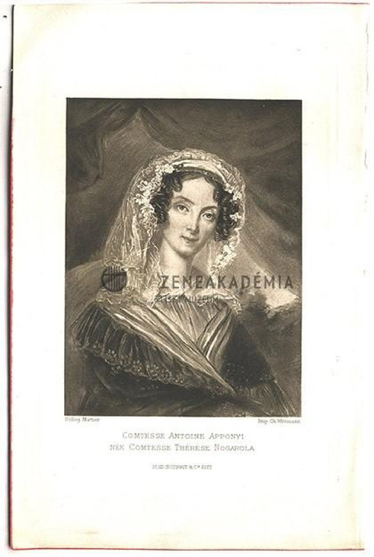 Fátylas portré a grófnőről. Fejét jobbra dönti. A kép alatt jobboldalt: "Imp. Ch. Wittmann" Baloldalt: "Heliog. Mortier" A kép alatt a cím: "COMTESSE ANTOINE APPONYI / NÉE COMTESSE THÉR?SE NOGAROLA" Alatta: "Plon-Nourrit & Cie Edit."