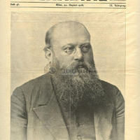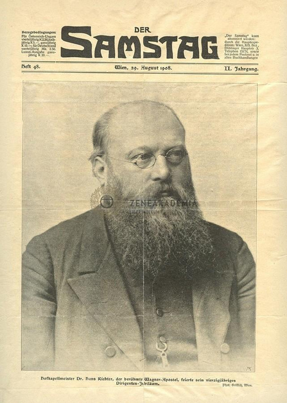 Mellkép Richter Jánosról. Kissé jobbra fordul. Szemüveget hord, hosszú, sűrű szakálla van. A kép alatt: "Hofkapellmeister Dr. Hans Richter, der berühmte Wagner-Apostel, feierte sein vierzigjähriges / Dirigenten-Jubiläum / Phot. Grillich, Wien." A lap tetején: "DER / SAMSTAG" Mellette két oldalt az újság megjelenésével kapcsolatos részletek. A cím alatt: "Heft 48. Wien, 29. August 1908. II. Jahrgang." Grillich fényképe alapján készült. "A.K." jelzéssel ellátva. A kép az újság címlapja.