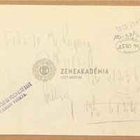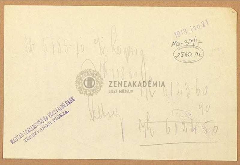 A Magyar Leszámítoló- és Pénzváltó Bank Terézvárosi Fiókjának kéziratos feljegyzése a Liszt összkiadással kapcsolatos számla kiegyenlítéséről. Nem jól olvasható.