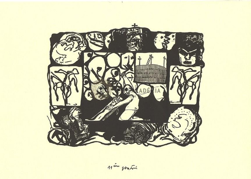 D.Vincent és G. Dégé: Liszt Via Crucisához készült grafika, a Passió állomásai. 11. stáció: Jézust rászögezik a keresztre.