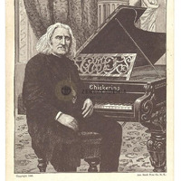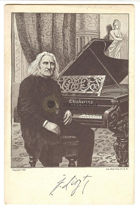 Liszt a felnyitott zongora előtt ül, félig háttal a zongorának. Szembenéz, nyakában lóg a szemüvege, a két keze az ölében nyugszik. A háttérben függöny, egy oszlop és egy szobor. A kép alatt balra felirat: “Copyright 1886” Jobb oldalon a kiadó megnevezése: “Am Bank Note Co. N.Y.” Alul, középen Liszt kézjegye. A kép hátoldalán L. levele Rómából Chickering& Son- hoz angol fordításban. (nyomtatott levél) Alul pecsét: “A.W.Brinkerhoff& Son, Upper Sandusky, Ohio."