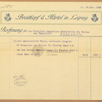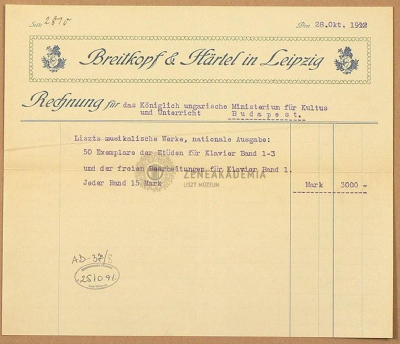 A Breitkopf és Härtel cég által kiállított számla a Magyar Királyi Oktatási - és Kultúrminisztériumnak a Liszt - művek nemzeti kiadásával kapcsolatban. A Zongoraetűdök 1-3. kötetéről és a Zongoraátiratok 1. kötetéről, összesen 50 példányban. (3000 márka)