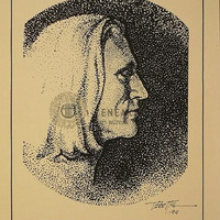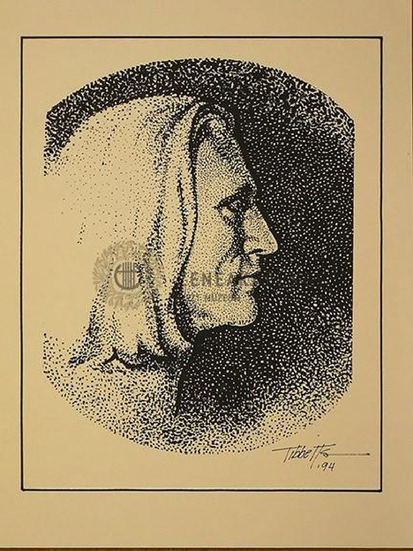 A középkorú Liszt arcképe, jobb profilban. A kép jobb alsó sarkában: "Tibbets 94". Két példány van belőle.