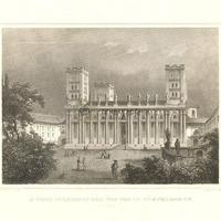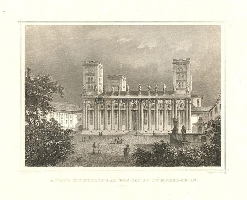A pécsi székesegyház képe klasszicista időszakából (1831 és 1882 között) szemből nézve, előtte macskaköves tér járókelőkkel. A jobb és bal alsó sarokban fák, a háttérben a felhős égbolt. A kép alatt felirat: "A PÉCSI SZÉKESEGYHÁZ - DER DOM IN FÜNFKIRCHEN." L. Rohbock rajza nyomán. A kép alatt baloldalt: "Rohbock delt." A kép alatt jobboldalt: "J. Poppel Sculpt".