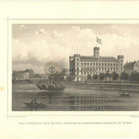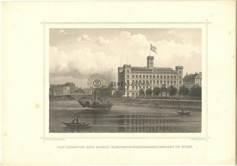 A Dunán egy gőzhajó és két csónak látható, a háttérben egy híd, jobbra a Gőzhajótársaság épülete, tornyán zászlóval. A kép alatt baloldalt: "L. Rohbock gezeichnet" A kép alatt jobboldalt: "M. Kolb gestochen". L. Rohbock rajza nyomán. A kép alatt középen: "DAS GEBÄUDE DER DONAU-DAMPFSCHIFFAHRTSGESELLSCHAFT IN WIEN."