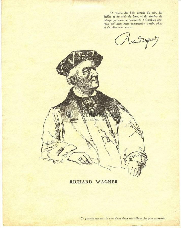 Öregkori derékkép, jobbra fordul. Jobb keze egy szék karfáján, bal keze az ölében. Jobbra néz, fején barett. Szignálva a jobb kéznél: "H. T. G." A portré alatt felirat: "RICHARD WAGNER". A jobb felső sarokban francia nyelvű idézet, alatta Wagner aláírásának hasonmása. Legalul jobbra: "Ce portrait recouvre le nom dune firme marseillaise des plus respectées."