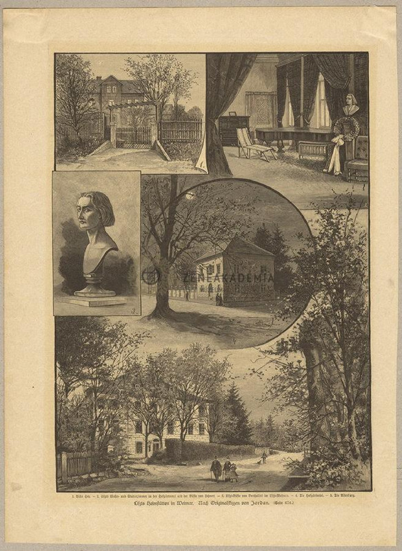 Öt részes kompozíció. Jordan eredeti vázlata nyomán ismeretlen szerző készítette. Fő felirat: "Liszts Heimstätten in Weimar. Nach Originalskizzen von Jordan (Seite 674.)" A képek: 1. "Villa Hey" 2. "Liszts Wohn- und Studirzimmer in der Hofgärtnerei mit der Büste von Lehnert" [Liszt lakó- és dolgozószobája a Hofgärtnereiben. Lehnert mellszobrával.] 3. "Liszt-Büste von Bertholini [sic]" [Bartolini Liszt-mellszobra] 4. "Die Hofgärtnerei" 5. "Die Altenburg". A képek négyzet alakú keretben, a középső köralakú.
