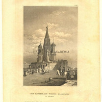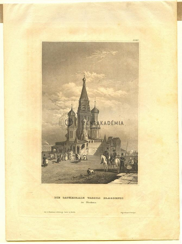 A katedrális szemből, előtte hatalmas téren emberek. A templomból körmenet indul. Jobboldalt katonák és két kutya. A kép alatt középen: "DIE CATHEDRALE WASSILI BLASSENOI / in Moskau", baloldalt: "Aus d. Kunstanst d. Bibliogr. Instit in Hildbh.", jobboldalt: "Eigenthum d. Verleger".
