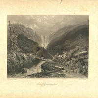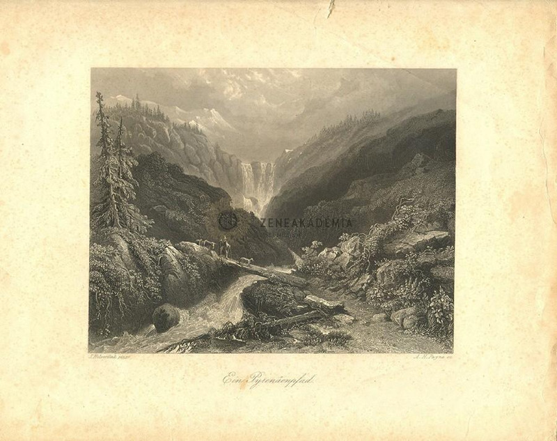 Zord táj, sziklákkal, fenyőkkel. Középen egy patak, rajta keskeny fahíd, melyen egy férfi kel át, előtte kutyája, mögötte lova. A háttérben vízesés, amely a patakba torkollik. Az ég borús. Alul középen díszes felirat: "Ein Pyrenäenpfad". Kép alatt bal oldalon: "J. Hilverdink pinxt", jobboldalt: "A.H. Payne sc." A. H. Payne műve alapján.