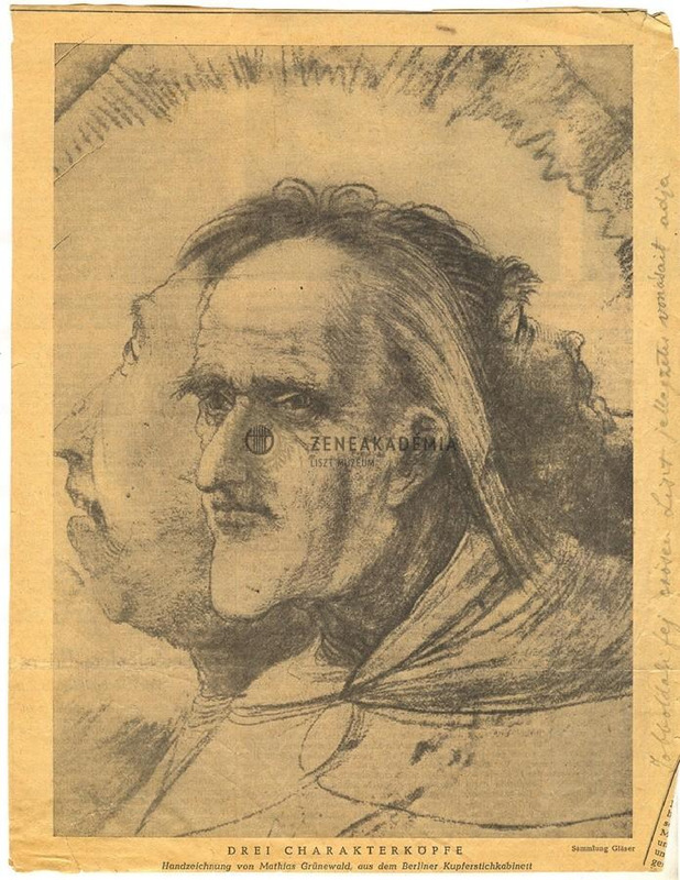 Három egybenőtt fej, a középső erősen emlékeztet Lisztre. A kép alatt felirat: "DREI CHARAKTERKÖPFE / Handzeichnung von Mathias Grünewald, aus dem Berliner Kupferstichkabinett". A kép alatt jobboldalt: "Sammlung Gläser". A rajzon kívül a jobb szélen ceruzás felirat: "Jobboldali [sic] fej erősen Liszt jellegzetes vonásait adja". Újságkivágat, hátoldalán cikkrészletek.