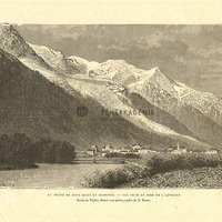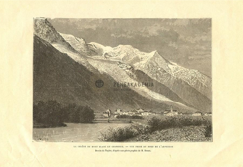 Kilátás az Arveiron partjáról. Az előtérben a folyó híddal, kis faluval, a háttérben hófödte hegyek. Alul felirat: "LA CHAINE DU MONT BLANC ET CHAMONIX. - VUE PRISE DU BORD DE LARVEIRON / Dessin de Taylor, dapr?s une photographie de M. Braun." Jelzés a képmezőben jobbra lent: "C. LAPLANTE", balra lent: "TAYLOR." M. Braun fotója alapján készült.