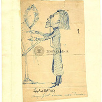 Karikatúra, egész alakos kép bal profilban. Liszt orrán cvikkerrel, kottatartó előtt állva vezényel, a kotta fölött babérkoszorú. Reverendaszerű kabátja alól nadrág és hegyes cipő látszik ki. A karikatúra eredeti felirata lent középen: "Magnificat anima mea Domine"[sic]. E feliratfölött más kéz írásával cím: "Liszt at Pesth, 1869." Sárgásszürke papíron sűrű csíkos vízjelekkel. Valószínűleg albumból vágták kis és ragasztották föl egy nagyobb fehér lapra..