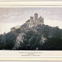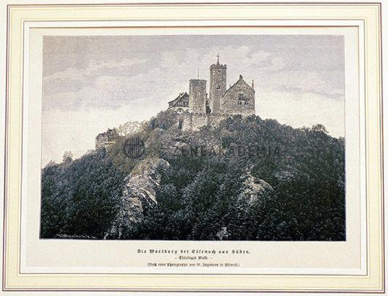 A vár sziklás, részben bokrokkal benőtt hegy tetején áll, baloldalt egy kisebb ház is látható. Szignálva a kép bal alsó sarkában: "R. HENKEL X.A." A kép alatt középen feliratok: "Die Wartburg bei Eisenach von Süden / - Thüringer Wald. - / (Nach einer Photographie von G. Jagemann in Eisenach)" [Az Eisenach melletti Wartburg Délről nézve. - Türingiai Erdő. - (Az eisenachi G. Jagemann fényképe alapján.)]