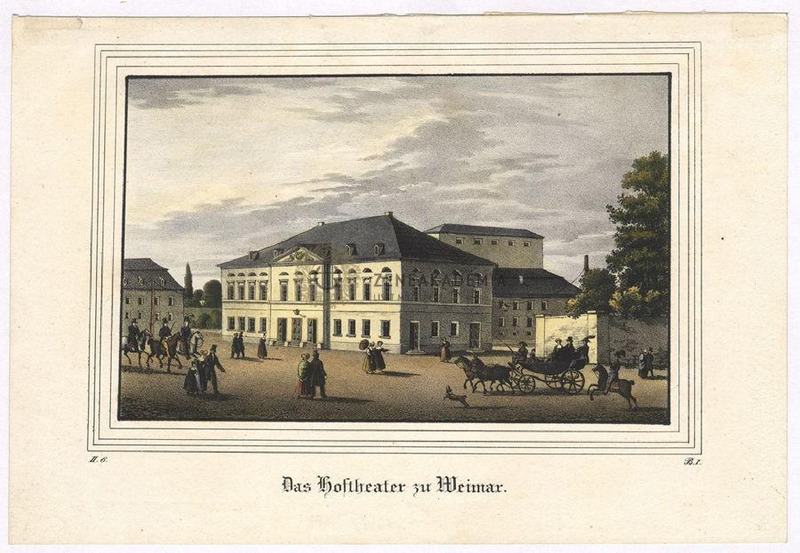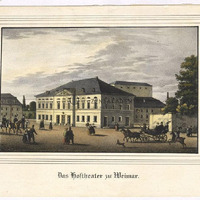 Az épület a tér közepén, előtte a téren sétáló emberek, lovasok, szekér. A kép alatt felirat: "Das Hoftheater zu Weimar" Bal alsó sarokban: "II.6" Jobb alsó sarokban: "B. I." Jelzetlen.