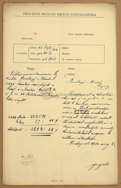 A Zeneakadémia feljegyzése arról, hogy a vallás-és közoktatásügyi magyar királyi minisztérium a Breitkopf és Härtel cégnek átutalt 3000 márkát a Liszt-összkiadás 3., 4.,6. és 10. köteteiért.