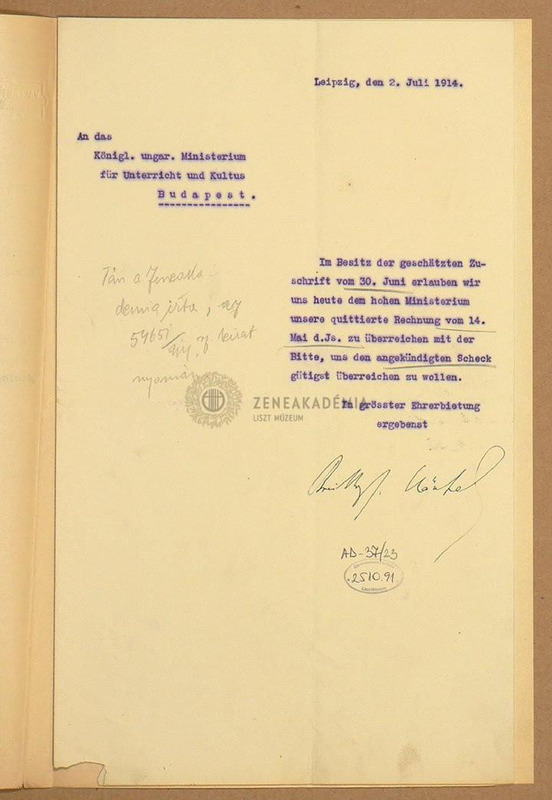 A Breitkopf és Härtel cég levele a vallás-és közoktatásügyi magyar királyi minisztériumnak, melyben a Liszt-összkiadás esedékes költségeinek rendezését kérik.