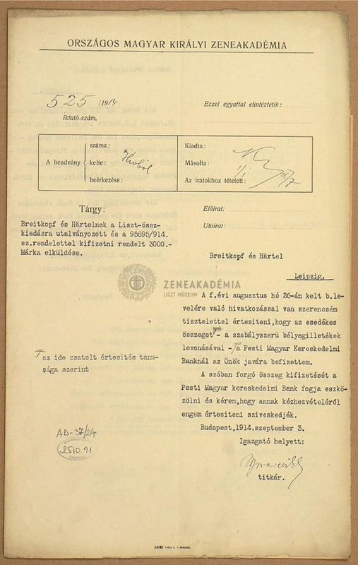 A Zeneakadémia feljegyzése a Breitkopf és Härtel cégnek átutalt 3000 márkáról a Liszt-összkiadás 3., 4.,6. és 10. köteteiért (a szabályszerű bélyegilletékek levonásával).