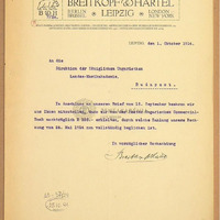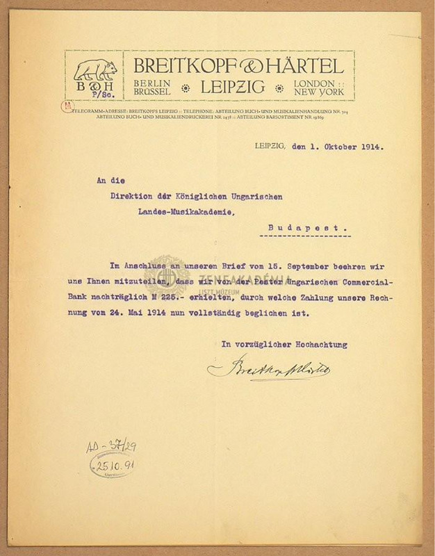 A Breitkopf és Härtel cég levele a Zenekakadémia igazgatóságának arról, hogy a fennmaradó 225 márkát a Pesti Magyar Kereskedelmi Banktól megkapta.