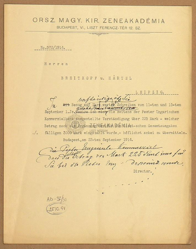 A Zeneakadémia igazgatójának levele a Breitkopf és Härtel cégnek a fennmaradó 225 márka elküldéséről.