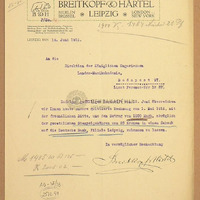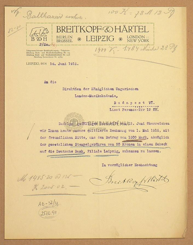 A Breitkopf és Härtel cég levele a Zeneakadémiának arról, hogy a Liszt-összkiadás 11. és 13. kötetéért elutalt 1500 márkából a bélyegilleték miatt még 20 márka megküldését kérik, a Deutsche Bank-on keresztül.