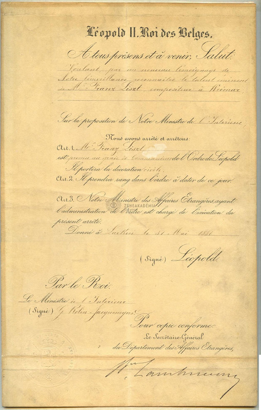 A belga külügyminisztérium (Ministere des affaires Étrangers) által Lisztnek adományozott Lipót-rend "commandeur" fokozata.