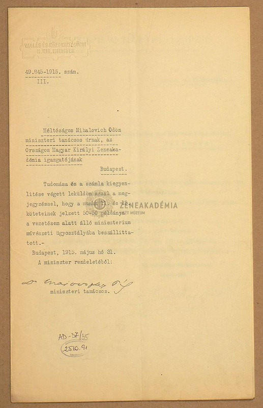 A vallás-és közoktatásügyi magyar királyi minisztérium miniszteri tanácsosának levele a Zeneakadémia igazgatójának, Mihalovich Ödönnek a Liszt-összkiadás 11.és 13. kötete számlájának kiegyenlítése végett és közli, hogy azok 50-50 példányban megérkeztek.