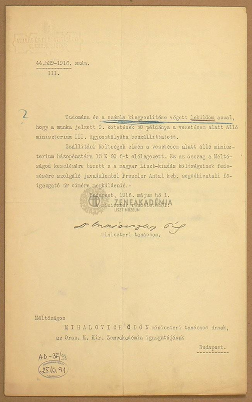 A minisztertanácsos (vallás-és közoktatásügyi magyar királyi minisztérium) levele Mihalovich Ödönnek, a Zeneakadémia igazgatójának arról, hogy a Liszt-összkiadás 9. kötetének 50 példánya megérkezett és szállítási költségekre a minisztérium 13 korona 60 fillért előlegzett, melyet Preszler Antal segédhivatali főigazgatónak kell elküldeni.